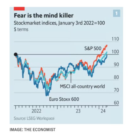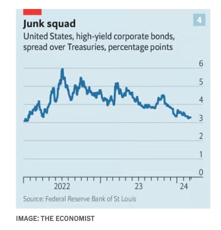 Οι επενδυτές δεν φαίνονται ακόμη αρκετά ενθουσιασμένοι για να συμβεί κάτι τέτοιο. Ωστόσο, όπως και το 2021, το φθηνότερο χρέος θα μπορούσε να τους βοηθήσει να αποκτήσουν διάθεση. Οι δανειστές διοχετεύουν χρήματα προς τους ριψοκίνδυνους εταιρικούς δανειολήπτες υψηλής απόδοσης (ή «σκουπίδια»), μειώνοντας το περιθώριο που πληρώνουν πάνω από την απόδοση του κρατικού χρέους (βλ. διάγραμμα 4). Όταν οι αξιωματούχοι της Ομοσπονδιακής Τράπεζας των ΗΠΑ συνεδριάσουν στις 20 Μαρτίου, οποιοσδήποτε υπαινιγμός για μειώσεις επιτοκίων θα μπορούσε να είναι η ώθηση που αναζητούν οι επενδυτές. Για καλό και για κακό, ας έχετε πρόχειρο κανένα αναλγητικό για την κατάβαση.