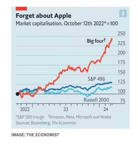 Πώς θα ήταν, λοιπόν, αν τα πράγματα έπαιρναν μια ευφορική τροπή; Ένα ισχυρό σήμα θα ήταν τα κέρδη που μέχρι στιγμής έχουν συγκεντρωθεί γύρω από λίγες μετοχές μεγάλης κεφαλαιοποίησης να εξαπλωθούν ευρύτερα στην αγορά. Στο σερί νίκης των τελευταίων μηνών δεν κυριάρχησαν οι «υπέροχοι επτά» τεχνολογικοί γίγαντες της Αμερικής, αλλά μόνο τέσσερις από αυτούς. Η Amazon, η Meta, η Microsoft και η Nvidia έχουν αφήσει πίσω τους τις υπόλοιπες 496 μετοχές του S&P 500. Αυτές οι άλλες, με τη σειρά τους, έχουν ανακάμψει από την καταστροφή του 2022 πολύ καλύτερα από τις μικρότερες εταιρείες που εκπροσωπούνται στον δείκτη Russell 2000 (βλ. διάγραμμα 3). Αν οι επενδυτές αρχίσουν να μην είναι προσεκτικοί, αναμείνατε να ξεκινήσουν να ποντάρουν σε πιο ριψοκίνδυνες μικρομεσαίες εταιρείες, αλλά και σε γίγαντες -ιδιαίτερα σε εκείνες τις εταιρείες που καταφέρνουν να βάζουν τα γράμματα «ΤΝ» στις ετήσιες εκθέσεις τους.