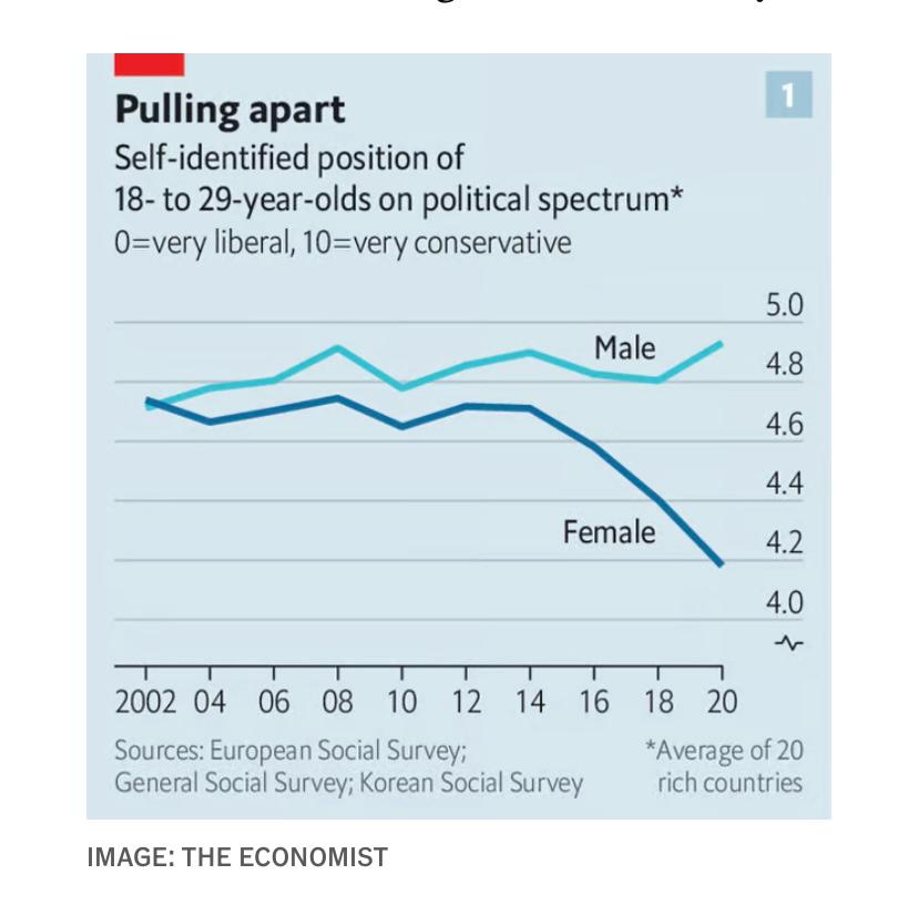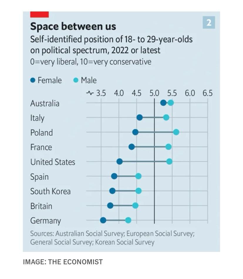 Σε όλες τις μεγάλες χώρες που εξετάσαμε, οι νέοι άνδρες ήταν πιο συντηρητικοί από τις νέες γυναίκες (βλ. διάγραμμα 2). Στην Πολωνία η διαφορά ήταν 1,1 μονάδες σε μια κλίμακα 1-10. Στην Αμερική ήταν 1,4, στη Γαλλία 1, στην Ιταλία 0,75, στη Βρετανία 0,71 και στη Νότια Κορέα 0,74. Οι άνδρες και οι γυναίκες ανέκαθεν έβλεπαν τον κόσμο με διαφορετικό τρόπο. Αυτό που προκαλεί εντύπωση, όμως, είναι το τεράστιο χάσμα στις πολιτικές απόψεις, καθώς οι νεότερες γυναίκες γίνονται σαφώς πιο φιλελεύθερες, ενώ οι άνδρες συνομήλικοί τους όχι.