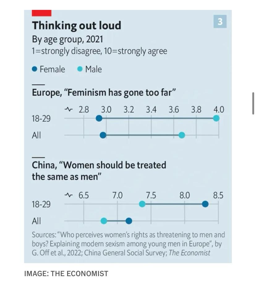 Στην Κίνα οι δημοσκόποι δεν ρωτούν για την πρόθεση ψήφου, αλλά διαπιστώνουν μια παρόμοια απόκλιση μεταξύ των νέων ανδρών και γυναικών όσον αφορά τους ρόλους των δύο φύλων (βλ. διάγραμμα 3). Οι Yue Qian του Πανεπιστημίου της Βρετανικής Κολομβίας και Jiaxing Li του Πανεπιστημίου Ιατρικής και Επιστημών Υγείας της Σαγκάης εξέτασαν στοιχεία έρευνας για 35.000 Κινέζους. Στην ανάλυσή τους διαπίστωσαν ότι οι νέοι άνδρες ήταν πολύ πιθανότερο από τις νεαρές γυναίκες να συμφωνήσουν με δηλώσεις όπως «οι άνδρες πρέπει να βάζουν πρώτα την καριέρα, ενώ οι γυναίκες την οικογένεια» και «όταν η οικονομία είναι κακή, οι γυναίκες εργαζόμενες πρέπει να απολύονται πρώτες».
