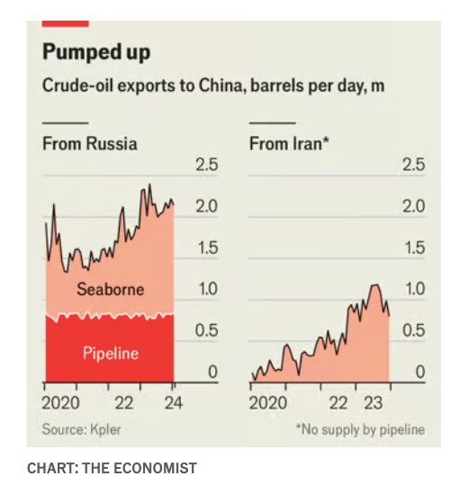 Ας ξεκινήσουμε με την άνθηση των επιχειρήσεων. Η Κίνα είναι εδώ και καιρό μεγάλος πελάτης των πετρελαϊκών χωρών, συμπεριλαμβανομένων του Ιράν και της Ρωσίας. Ωστόσο, αυτά τα δύο κράτη πωλούσαν πολλά πετρέλαια στην Ευρώπη, η οποία βρισκόταν κοντά στα κοιτάσματα της Ρωσίας και ήταν εύκολα προσβάσιμη από τον Κόλπο. Από τότε που η Ευρώπη άρχισε να σνομπάρει τις δύο αυτές χώρες, η Κίνα αγοράζει βαρέλια σε τιμή ευκαιρίας. Ο Reid l’Anson της εταιρείας δεδομένων Kpler υπολογίζει ότι οι εισροές από τα δυτικά λιμάνια της Ρωσίας έχουν αυξηθεί σε 500.000 βαρέλια ημερησίως, από λιγότερα από 100.000 προπολεμικά. Τον Δεκέμβριο οι εισαγωγές ρωσικού αργού έφτασαν τα 2,2 εκατ. βαρέλια ημερησίως, ή το 19% του συνόλου της Κίνας, από 1,5 εκατ. βαρέλια ημερησίως πριν από δύο χρόνια. Κατά το δεύτερο εξάμηνο του περασμένου έτους οι εξαγωγές του Ιράν προς την Κίνα ανήλθαν κατά μέσο όρο σε 1 εκατ. βαρέλια ημερησίως, σημειώνοντας αύξηση 150% σε σχέση με την ίδια περίοδο το 2021.