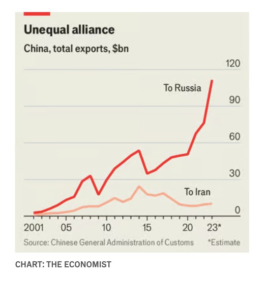Οι εξαγωγές της Κίνας προς τη Ρωσία αυξήθηκαν δεόντως. Καθώς οι κανόνες της Covid-19 στραγγάλιζαν την οικονομία της, η Κίνα προσπάθησε να αντισταθμίσει την κατάσταση ενισχύοντας τις εξαγωγές μεταποιητικών προϊόντων. Αντί για παπούτσια και μπλουζάκια, προσπάθησε να πουλήσει προϊόντα υψηλής αξίας, όπως μηχανήματα και μηχανικές συσκευές, για τα οποία η Ρωσία λειτούργησε ως δοκιμαστική αγορά. Πέρυσι ο μεγαλύτερος εισαγωγέας κινεζικών αυτοκινήτων δεν ήταν η Ευρώπη, προορισμός για τα ηλεκτρικά της οχήματα, αλλά η Ρωσία, η οποία αγόρασε τρεις φορές περισσότερα βενζινοκίνητα αυτοκίνητα απ’ ό,τι πριν από τον πόλεμο.