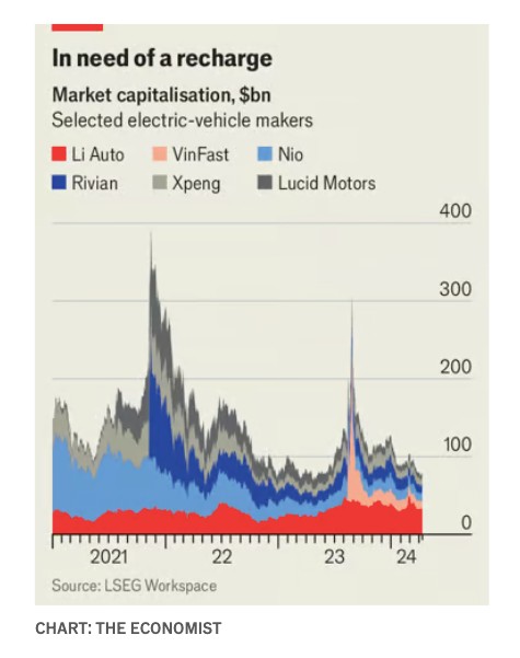 Σήμερα η αξία των έξι είναι 65 δισεκατομμύρια δολάρια, με φθίνουσα πορεία (βλ. διάγραμμα). Η Fisker, μια αμερικανική εταιρεία οκτώ ετών, και η HiPhi, μια κινεζική εταιρεία πέντε ετών, έχουν διακόψει την παραγωγή. Στις 25 Μαρτίου η καταρρέουσα τιμή της μετοχής της Fisker προκάλεσε την αναστολή διαπραγμάτευσης των μετοχών της και η εταιρεία ενδέχεται σύντομα να διαγραφεί από το χρηματιστήριο. Η HiPhi ενδέχεται να ψάχνει να πωληθεί σε μια μεγάλη καθιερωμένη κινεζική αυτοκινητοβιομηχανία. Η Faraday Future, η οποία πούλησε μόλις 11 από τα υπερσύγχρονα ηλεκτρικά της αυτοκίνητα πέρυσι, κινείται στα πρόθυρα της χρεοκοπίας. Η Lordstown, μια αμερικανική startup που ιδρύθηκε το 2018 για να κατασκευάσει ηλεκτρικά pickups και SUVs, χρεοκόπησε το 2023.