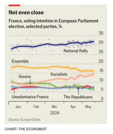 Μακροπρόθεσμα, η «ομαλοποίηση» του RΝ θέτει σοβαρά ερωτήματα σχετικά με την ικανότητα του πολιτικού κέντρου να αντισταθεί στην άνοδό του. Ο κ. Macron δεν μπορεί να θέσει υποψηφιότητα για τρίτη συνεχόμενη θητεία, το 2027, και δεν υπάρχει σαφής διάδοχος στον ορίζοντα. Βραχυπρόθεσμα, ένα συντριπτικό αποτέλεσμα για την Ensemble θα δώσει νέα πνοή στην αντιπολίτευση. Αυτό ισχύει για τον RΝ της κ. Le Pen, αλλά και για τους Σοσιαλιστές, ο υποψήφιος των οποίων, ο Raphaël Glucksmann, ακολουθεί κατά βήμα τον κ. Macron από τα αριστερά.