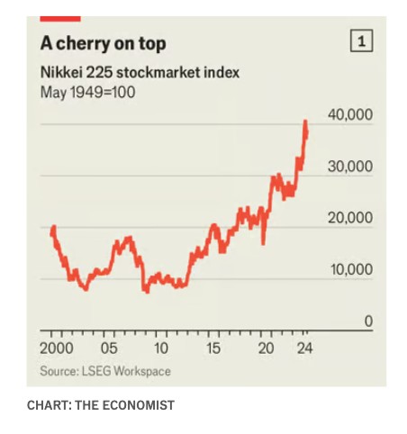 Οι ιαπωνικές επιχειρήσεις έχουν να δημιουργήσουν τόσο μεγάλο ενθουσιασμό από τη δεκαετία του 1980. Τα τελευταία δέκα περίπου χρόνια τα περιθώρια κέρδους των ιαπωνικών εταιρειών έχουν διπλασιαστεί. Δίνουν στους ιδιοκτήτες τους διπλάσια ποσά με τη μορφή μερισμάτων και επαναγοράς μετοχών απ’ ό,τι την προηγούμενη δεκαετία. Οι φιλικές προς τους μετόχους αλλαγές στην εταιρική διακυβέρνηση στην Ιαπωνία προκάλεσαν και πάλι συρροή ξένων επενδυτών στη χώρα. Έχοντας μαραζώσει για δεκαετίες, ο δείκτης Nikkei 225, ο οποίος παρακολουθεί την αξία των μεγαλύτερων εισηγμένων εταιρειών της χώρας, τον τελευταίο χρόνο αυξήθηκε κατά 25% (βλ. διάγραμμα 1). Τον Φεβρουάριο ξεπέρασε επιτέλους το ρεκόρ που είχε σημειώσει το 1989, λίγο πριν σκάσει η φούσκα της Ιαπωνίας.