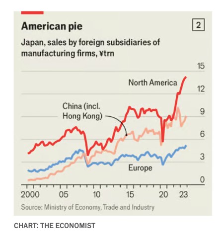 Πολλοί κάνουν το ίδιο και στην ίδια την Αμερική. Σύμφωνα με την Good Jobs First, ένα παρατηρητήριο επιχορηγήσεων, η Toyota και η Panasonic είναι μεταξύ των εταιρειών που λαμβάνουν ήδη πάνω από 1 δισ. δολάρια η καθεμία σε επιδοτήσεις χάρη στις προσπάθειες των πολιτειών και των ομοσπονδιακών αρχών, από το 2021, να αναζωογονήσουν την αμερικανική παραγωγή. Ο Rahm Emanuel, πρεσβευτής της Αμερικής στο Τόκιο, φλερτάρει έντονα με τις ιαπωνικές επενδύσεις. Οι Αμερικανοί κυβερνήτες επισκέπτονται τακτικά την Ιαπωνία, με την ελπίδα να προσελκύσουν χρήματα και να δημιουργήσουν θέσεις εργασίας στις πολιτείες τους. Σε αντάλλαγμα για μια επένδυση 8 δισ. δολαρίων από την Toyota στην παραγωγή μπαταριών στη Βόρεια Καρολίνα, η πολιτεία παρείχε στην εταιρεία εκατοντάδες εκατομμύρια δολάρια σε φορολογικά κίνητρα και κίνητρα για υποδομές. Η συγκριτικά ισχυρή οικονομική ανάπτυξη της Αμερικής αυξάνει την ελκυστικότητά της ως επενδυτικού προορισμού για τις ιαπωνικές επιχειρήσεις. Τα τελευταία δύο χρόνια οι πωλήσεις των θυγατρικών τους στην Αμερική έχουν αυξηθεί κατακόρυφα (βλ. διάγραμμα 2).