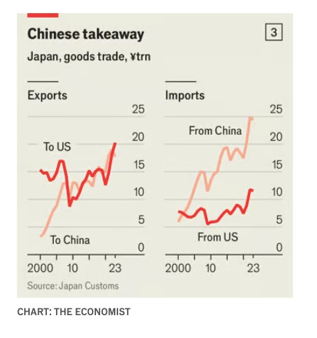 Ένας από τους λόγους για τους οποίους ελάχιστες ιαπωνικές εταιρείες είναι διατεθειμένες να διακόψουν τους δεσμούς τους με την Κίνα με τον τρόπο που το έκανε η Mitsubishi Motors είναι η δυσπιστία απέναντι στην Αμερική. Ακόμα και εκείνες που μειώνουν την κινεζική παραγωγή τους συχνά παραμένουν εξαρτημένες από τους προμηθευτές τους στην άλλη πλευρά της Ιαπωνικής Θάλασσας. Για πολλούς η κινεζική αγορά παραμένει πολύ προσοδοφόρα για να την εγκαταλείψουν. Τον Απρίλιο η Toyota και η Nissan συνεργάστηκαν αντίστοιχα με την Tencent και την Baidu, δύο κινεζικούς ψηφιακούς γίγαντες, σε μια προσπάθεια να ενισχύσουν τη δημοτικότητα των αυτοκινήτων τους μεταξύ των Κινέζων αυτοκινητιστών που λατρεύουν την τεχνολογία. Τα τελευταία δύο χρόνια οι ετήσιες εμπορικές συναλλαγές μεταξύ Ιαπωνίας και Κίνας ήταν περίπου κατά ένα τρίτο υψηλότερες απ’ ό,τι στα τέλη της δεκαετίας του 2010 (βλ. διάγραμμα 3). «Η Ιαπωνία δεν έχει την πολυτέλεια να ζήσει χωρίς την Κίνα», λέει ένα μέλος του διοικητικού συμβουλίου μιας μεγάλης ιαπωνικής εταιρείας.