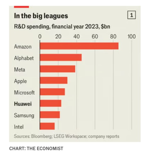Βλέποντας τις εξελίξεις, κάποιος θα μπορούσε κάλλιστα να πει ότι ο αμερικανικός αιφνιδιασμός κλόνισε την αυτοκρατορία της Huawei μόνο για λίγο. Οι πωλήσεις της πέρυσι, ύψους περίπου 100 δισ. δολαρίων, είναι διπλάσιες από αυτές της αμερικανικής Oracle. Έχει το μισό μέγεθος της νοτιοκορεατικής Samsung, αλλά την ξεπερνά σε δαπάνες για έρευνα και ανάπτυξη. Ο προϋπολογισμός της εταιρείας για έρευνα και ανάπτυξη, ύψους 23 δισ. δολαρίων το 2023, ξεπερνιέται μόνο από τις μεγαλύτερες αμερικανικές εταιρείες τεχνολογίας: Alphabet (μητρική της Google), Amazon, Apple και Microsoft (βλ. διάγραμμα 1). Τα περσινά κέρδη της, ύψους περίπου 12,3 δισ. δολαρίων, την τοποθετούν στο ίδιο επίπεδο με τον αμερικανικό όμιλο επικοινωνιών Cisco Systems, ενώ υπερβαίνουν κατά πολύ εκείνα της Ericsson και της Nokia, των κύριων αντιπάλων της στον τομέα των δικτύων κινητής τηλεφωνίας. Κι ενώ η Ericsson και η Nokia απολύουν προσωπικό, το προσωπικό της Huawei αυξάνεται. Σήμερα απασχολεί 12.000 περισσότερους εργαζομένους από ό,τι το 2021.