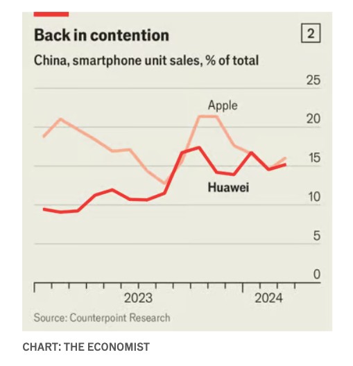 Σύμφωνα με εκτίμηση της επενδυτικής τράπεζας Jefferies, περίπου το 70% των εξαρτημάτων (σε αξία) του Mate60 Pro+, του smartphone που κυκλοφόρησε η Huawei τον Σεπτέμβριο, κατασκευάζονται στην Κίνα. Έτσι, τους πρώτους τρεις μήνες του 2024, η Huawei απέκτησε μερίδιο 15,5% στις πωλήσεις smartphone στην Κίνα, από περίπου 9% κατά την ίδια περίοδο του 2023, αγγίζοντας τα ίδια επίπεδα με την Apple (βλ. διάγραμμα 2). Αυτή η επιτυχία αποτέλεσε σημαντικό παράγοντα για την ανάκαμψη της εταιρείας.