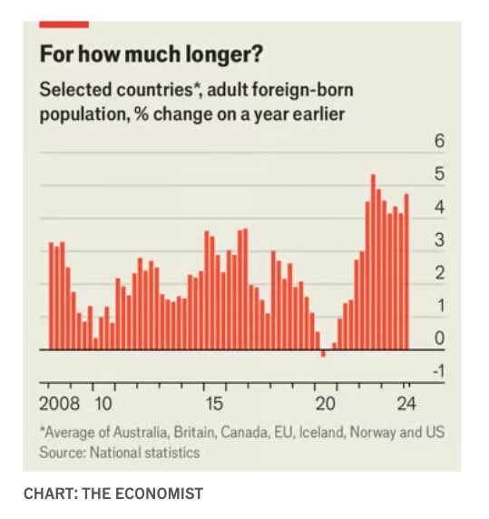 Πλέον υπάρχουν ενδείξεις ότι η έκρηξη μπορεί να έφτασε στο τέλος της. Η καθαρή μετανάστευση προς τον Καναδά υποχώρησε σχεδόν στο μισό από την πρόσφατη κορύφωσή της, ενώ στη Νέα Ζηλανδία μειώνεται απότομα. Ο πλούσιος κόσμος έχει λιγότερες κενές θέσεις εργασίας απ’ ό,τι στο παρελθόν, δίνοντας στους δυνητικούς μετανάστες λιγότερα κίνητρα να μετακινηθούν, ενώ η πλημμύρα των προσφύγων από την Ουκρανία έχει επιβραδυνθεί. Τα νέα αντιμεταναστευτικά μέτρα αρχίζουν επίσης να παίζουν ρόλο. Στην ΕΕ ο αριθμός των υπηκόων τρίτων χωρών που επιστράφηκαν στη χώρα τους, έπειτα από εντολή αποχώρησης, αυξήθηκε κατά 50% τα τελευταία δύο χρόνια. Το πρώτο τρίμηνο του 2024 οι «αναγκαστικές επιστροφές» από τη Βρετανία αυξήθηκαν κατά 50% σε ετήσια βάση. Οι παράνομες διελεύσεις στα νότια σύνορα της Αμερικής μειώθηκαν πρόσφατα σε χαμηλό τριών ετών.