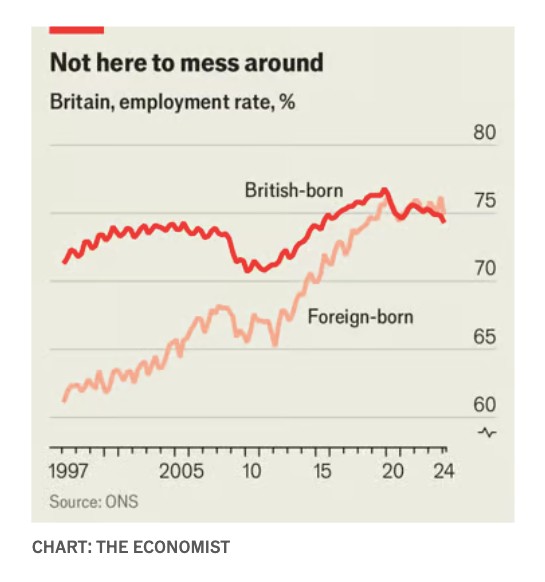 Ωστόσο, αυτό θα είχε μακροπρόθεσμο κόστος. Οι νέες αφίξεις βρίσκουν δουλειά. Αν και για δεκαετίες οι μετανάστες στη Βρετανία είχαν λιγότερες πιθανότητες από τους γηγενείς να εργαστούν, για πρώτη φορά αυτό πλέον δεν ισχύει (βλ. διάγραμμα 2). Το ποσοστό απασχόλησης των μεταναστών στην Ευρώπη είναι το ίδιο με εκείνο των γηγενών. Οι μετανάστες στην Αμερική είναι εδώ και καιρό πιθανότερο να εργάζονται απ’ ό,τι αυτοί που γεννήθηκαν στη χώρα και τους τελευταίους μήνες το χάσμα έχει διευρυνθεί. Η πάταξη της μετανάστευσης κινδυνεύει να προκαλέσει την επανεμφάνιση της έλλειψης εργατικού δυναμικού που ταλαιπώρησε τις πλούσιες οικονομίες το 2021 και το 2022 και η οποία επιβαρύνει το ΑΕΠ ανά άτομο δημιουργώντας αναποτελεσματικότητα. Μακροπρόθεσμα, η μετανάστευση επιτρέπει επίσης μεγαλύτερη εξειδίκευση του εργατικού δυναμικού.