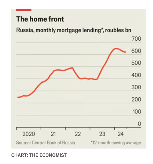 Αυτή η εξέλιξη αντικατοπτρίζει το γεγονός ότι οι Ρώσοι δεν έχουν πολλές επενδυτικές ευκαιρίες: οι κυρώσεις επιβαρύνουν το χρηματιστήριο και οι συναλλαγματικοί έλεγχοι καθιστούν δύσκολη τη μεταφορά χρημάτων στο εξωτερικό. Ο πληθωρισμός, ο οποίος επανήλθε δυναμικά στα μέσα το 2023, έπαιξε επίσης ρόλο -και όχι μόνο δίνοντας στους Ρώσους ένα κίνητρο για να επενδύσουν χρήματα σε ακίνητα. Όταν η Κεντρική Τράπεζα της Ρωσίας (CBR) άρχισε να αυξάνει τα επιτόκια, η ελκυστικότητα του προγράμματος αυξήθηκε. Καθώς η CBR ανέβασε το επιτόκιο αναφοράς της στο 16%, η κυβέρνηση διατήρησε το προνομιακό της επιτόκιο σε χαμηλά επίπεδα, ανεβάζοντάς το μόλις στο 8%. Τον Ιούνιο η διαφορά μεταξύ του κυβερνητικού επιτοκίου και του επιτοκίου της αγοράς για ένα ενυπόθηκο δάνειο ήταν άνω των δέκα ποσοστιαίων μονάδων.