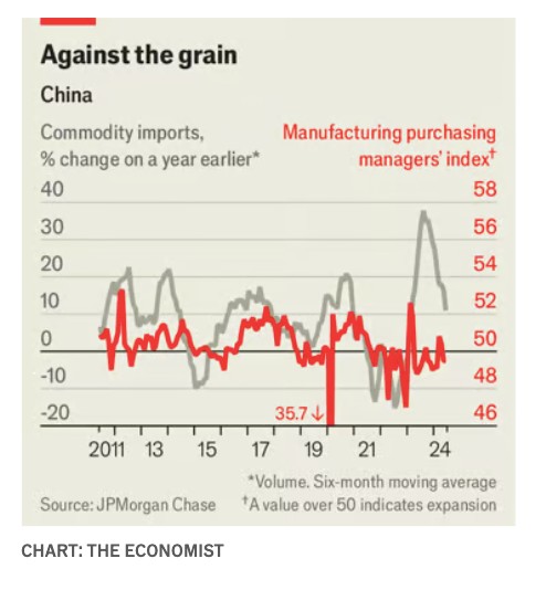 Τις τελευταίες δύο δεκαετίες η Κίνα έχει καταναλώσει τεράστιες ποσότητες πρώτων υλών. Ο πληθυσμός της αυξήθηκε και έγινε πλουσιότερος, απαιτώντας περισσότερα γαλακτοκομικά προϊόντα, σιτηρά και κρέας. Οι γιγάντιες βιομηχανίες της διψούν για ενέργεια και μέταλλα. Τα τελευταία χρόνια, ωστόσο, η οικονομία της υπέφερε εξαιτίας της πολιτικής κακοδιαχείρισης και της κρίσης της αγοράς ακινήτων. Οι Κινέζοι αξιωματούχοι επιθυμούν διακαώς να απομακρυνθούν από τις βιομηχανίες έντασης πόρων. Η λογική υπαγορεύει ότι η όρεξη της χώρας για πρώτες ύλες οφείλει να συρρικνώνεται, και μάλιστα γρήγορα.