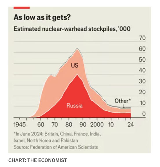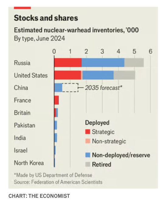 Τώρα ο κ. Narang λέει ότι το τέταρτο του αιώνα «πυρηνικής διακοπής» τελείωσε. Η Ρωσία έχει επανειλημμένα απειλήσει να χρησιμοποιήσει πυρηνικά όπλα στην Ουκρανία. Η Αμερική λέει ότι η Ρωσία, κατά παράβαση της Συνθήκης για το Διάστημα του 1967, σχεδιάζει επίσης να αναπτύξει πυρηνικά όπλα σε τροχιά, σχεδιασμένα να καταστρέφουν δορυφόρους. Το οπλοστάσιο της Κίνας, εν τω μεταξύ, επεκτείνεται με ταχείς ρυθμούς. Το Πεντάγωνο εκτιμά ότι μπορεί να αυξηθεί από μερικές εκατοντάδες πυρηνικές κεφαλές στο γύρισμα της δεκαετίας σε περισσότερες από 1.000 μέχρι το 2030 και ίσως σε 1.500 μέχρι το 2035. Η Βόρεια Κορέα έχει εντείνει τις δοκιμές διηπειρωτικών βαλλιστικών πυραύλων (ICBM) που θα μεταφέρουν τα πυρηνικά της. Τον Ιούνιο υπέγραψε συνθήκη αμοιβαίας άμυνας με τη Ρωσία. Η Βόρεια Κορέα έχει προμηθεύσει τη Ρωσία με βλήματα πυροβολικού. Τι δίνει σε αντάλλαγμα η Ρωσία; Η Αμερική φοβάται ότι μπορεί να είναι πυραυλική και άλλη οπλική τεχνολογία. Παρόμοιες ανησυχίες ισχύουν και για το Ιράν, που είναι πλέον πυρηνικό κράτος «κατωφλίου», το οποίο έχει προμηθεύσει τη Ρωσία με μη επανδρωμένα αεροσκάφη και πυραύλους.