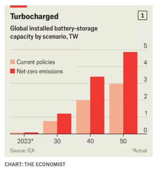 Για την απανθρακοποίηση της ηλεκτρικής ενέργειας παγκοσμίως θα χρειαστούν περισσότερα από ηλιακούς συλλέκτες και ανεμογεννήτριες, που βασίζονται στην ηλιοφάνεια και το σταθερό αεράκι για να παράγουν. Η αποθήκευση σε κλίμακα δικτύου προσφέρει μια λύση στο πρόβλημα των διαλείψεων, αλλά αυτή τη στιγμή είναι ανεπαρκής. Ο Διεθνής Οργανισμός Ενέργειας (ΔΟΕ), εκτιμά ότι εάν ο κόσμος θέλει να παραμείνει στην πορεία για καθαρές μηδενικές εκπομπές (βλ. διάγραμμα 1), η παγκόσμια εγκατεστημένη χωρητικότητα αποθήκευσης σε μπαταρίες θα πρέπει να αυξηθεί από λιγότερα από 200 γιγαβάτ (GW) πέρυσι σε περισσότερα από ένα τεραβάτ (TW) μέχρι το τέλος της δεκαετίας και σχεδόν 5TW μέχρι το 2050,. Ευτυχώς, όμως, η αποθήκευσης ενέργειας στο δίκτυο επιτέλους επιταχύνεται.