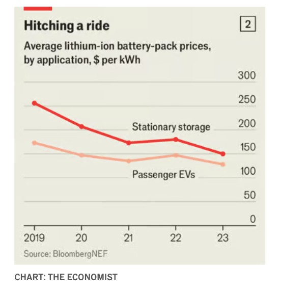 Η πτώση της τιμής των μπαταριών λιθίου ενισχύει την υιοθέτησή τους στο δίκτυο. Σύμφωνα με τον ερευνητικό όμιλο BloombergNEF, μεταξύ 2019 και 2023, η μέση τιμή των σταθερών μπαταριών λιθίου ανά κιλοβατώρα αποθήκευσης μειώθηκε κατά περίπου 40%. Η παγκόσμια επιβράδυνση της υιοθέτησης των ηλεκτρικών οχημάτων (EV), τα οποία λειτουργούν με παρόμοια τεχνολογία, οδήγησε τους κατασκευαστές μπαταριών να ενδιαφερθούν περισσότερο για την αποθήκευση στο δίκτυο. Το 2019 οι σταθερές μπαταρίες λιθίου ήταν σχεδόν 50% ακριβότερες από εκείνες που χρησιμοποιούνται στα Ηλεκτρικά Οχήματα. Η διαφορά αυτή μειώθηκε σε λιγότερο από 20% καθώς οι παραγωγοί συσσώρευσαν (βλ. διάγραμμα 2). Ο ΔΟΕ εκτιμά ότι η ηλιακή ενέργεια σε συνδυασμό με μπαταρίες είναι πλέον ανταγωνιστική με την ενέργεια από άνθρακα στην Ινδία και είναι σε καλό δρόμο ώστε, σε λίγα χρόνια, να είναι φθηνότερη από την ενέργεια από φυσικό αέριο στην Αμερική.