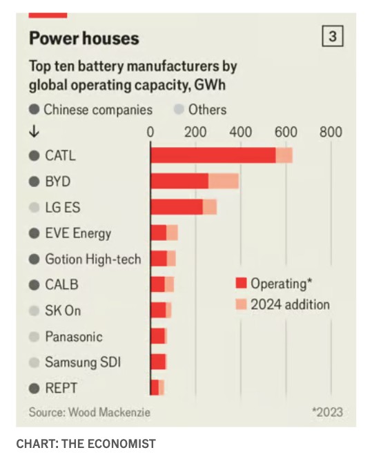 Οι εταιρείες μπαταριών της Κίνας είναι ιδιαίτερα καινοτόμες. Από το 2018, η CATL οκταπλασίασε τις δαπάνες της για έρευνα και ανάπτυξη, σε 2,5 δισ. δολάρια πέρυσι. Η BYD, η οποία επενδύει σημαντικά στη ρομποτική και την τεχνητή νοημοσύνη, κατασκεύασε ένα εργοστάσιο μπαταριών στην πόλη Hefei που είναι σχεδόν εξ ολοκλήρου αυτοματοποιημένο. Ωστόσο, η βιομηχανία κολυμπά επίσης στην πλεονάζουσα χωρητικότητα. Σύμφωνα με τον BloombergNEF, η Κίνα μόνο παράγει ήδη αρκετές μπαταρίες λιθίου για να καλύψει την παγκόσμια ζήτηση όλων των τύπων. Η βιομηχανία της έχει ανακοινώσει σχέδια για περαιτέρω 5,8 τεραβατώρες (TWh) χωρητικότητας έως το 2025, υπερδιπλάσια της σημερινής παγκόσμιας των 2,6 TWh.