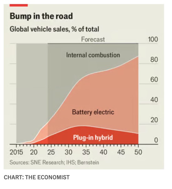 Η Bernstein προβλέπει ότι, μέχρι το 2030, τα PHEV θα κατακτήσουν αυξανόμενο μερίδιο της αγοράς αυτοκινήτων, αλλά ότι πωλήσεις θα σταθεροποιηθούν και τελικά θα μειωθούν καθώς οι πωλήσεις των BEV θα επιταχυνθούν (βλ. διάγραμμα). Τα υβριδικά «μπορεί να κερδίζουν τώρα, αλλά τα BEV θα είναι οι τελικοί νικητές», εκτιμά ο Patrick Hummel της τράπεζας UBS. Ο Xavier Smith της AlphaSense, μιας εταιρείας συμβούλων, πιστεύει ότι η σημερινή εμμονή των αυτοκινητοβιομηχανιών με τα υβριδικά θα αποδειχθεί κοντόφθαλμη. Όσοι χάσουν την εστίαση στην ηλεκτροκίνηση θα μπορούσαν σύντομα να μείνουν πίσω.