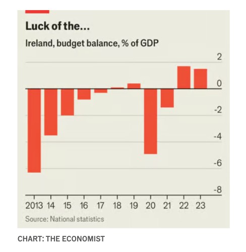 Σε όλη την Ευρώπη η δημοσιονομική πολιτική προκαλεί πονοκέφαλο. Οι κυβερνήσεις της Βρετανίας και της Γαλλίας αυξάνουν κατακόρυφα τους φορολογικούς συντελεστές. Η Γερμανία είναι καθηλωμένη από ένα αυτοεπιβαλλόμενο φρένο χρέους, ενώ ο άκρατος δανεισμός της Ιταλίας συνεχίζει να ανησυχεί τους επενδυτές. Η Ιρλανδία από την άλλη, αντιμετωπίζει ένα διαφορετικό πρόβλημα: η κυβέρνηση έχει τόσο πολύ χρήμα που δεν ξέρει τι να το κάνει.