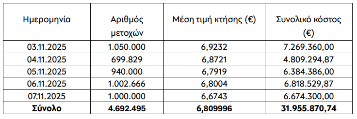 και σε συνέχεια της ανακοίνωσης της 27.10.2025 και 03.11.2025 σχετικά με την αγορά ιδίων μετοχών, ενημερώνει το κοινό ότι κατά το διάστημα 03.11.2025 – 07.11.2025 η Τράπεζα απέκτησε συνολικά, στο πλαίσιο του Προγράμματος, 4.692.495 μετοχές εκδόσεως της Εταιρείας («Ίδιες Μετοχές») που διαπραγματεύονται στο Χρηματιστήριο Αθηνών («Χ.Α.»), με μέση τιμή κτήσης € 6,809996 ανά μετοχή και συνολικό κόστος €31.955.870,74.