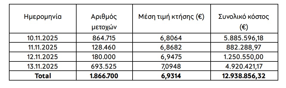και σε συνέχεια των ανακοινώσεων της 27.10.2025, 03.11.2025 και 10.11.2025 σχετικά με την αγορά ιδίων μετοχών, ενημερώνει το κοινό ότι κατά το διάστημα 10.11.2025 – 14.11.2025 η Τράπεζα απέκτησε συνολικά, στο πλαίσιο του Προγράμματος, 1.866.700 μετοχές εκδόσεως της Εταιρείας («Ίδιες Μετοχές») που διαπραγματεύονται στο Χρηματιστήριο Αθηνών («Χ.Α.»), με μέση τιμή κτήσης €6,9314 ανά μετοχή και συνολικό κόστος €12.938.856,32.