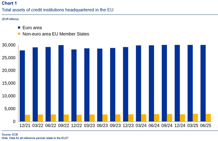 Αύξηση της τάξης του 1,75% κατέγραψε το ενεργητικό των ευρωπαϊκών τραπεζών τον Ιούνιο σύμφωνα με την ΕΚΤ, από 32,7 τρισ. ευρώ τον Ιούνιο του 2024 στα 33,27 τρισ. φέτος.