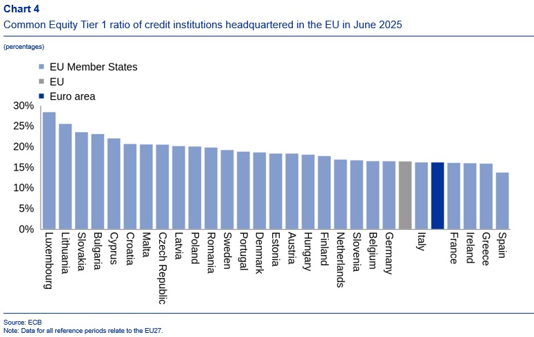 Η συνολική απόδοση ιδίων κεφαλαίων των πιστωτικών ιδρυμάτων της ΕΕ ήταν 5,06% τον Ιούνιο του 2025 και ο δείκτης Κύριων Βασικών Ιδίων Κεφαλαίων (Common Equity Tier 1) διαμορφώθηκε στο 16,42%.