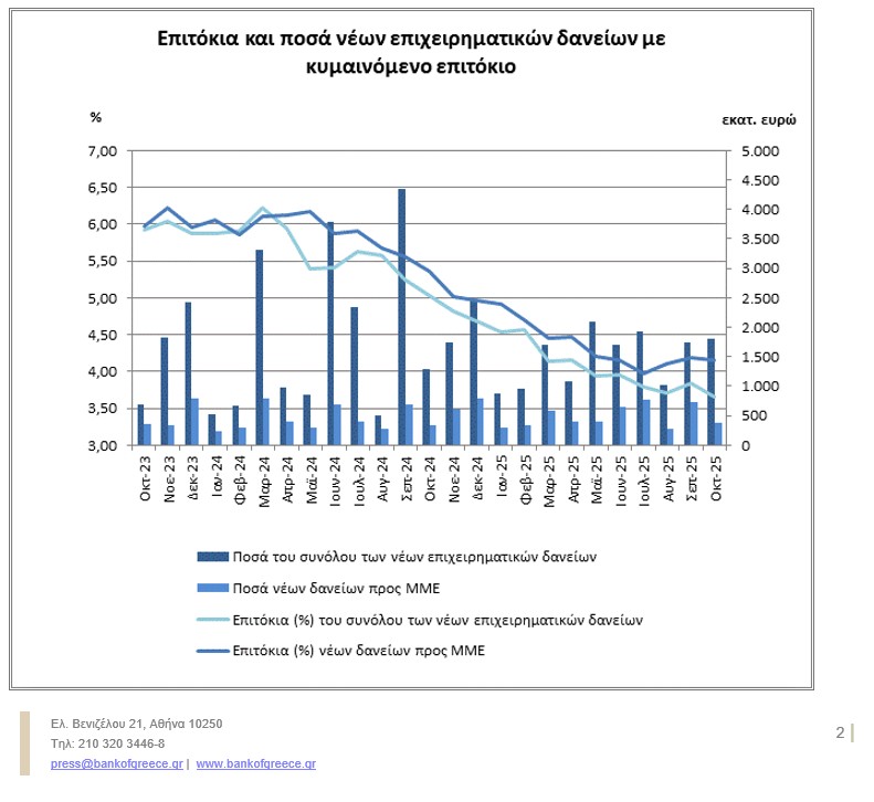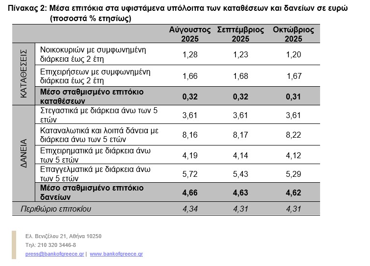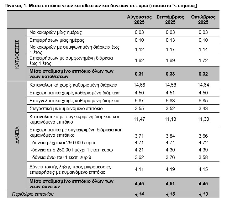 Τον Οκτώβριο του 2025 παρατηρήθηκε μείωση στο μέσο σταθμισμένο επιτόκιο των νέων δανείων προς νοικοκυριά και επιχειρήσεις, που διαμορφώθηκε στο 4,45%. Αντίθετα, το αντίστοιχο επιτόκιο των νέων καταθέσεων παρέμεινε σχεδόν αμετάβλητο στο 0,32%. Η εξέλιξη αυτή οδήγησε σε μείωση του περιθωρίου επιτοκίου μεταξύ καταθέσεων και δανείων στις 4,13 εκατοστιαίες μονάδες.
