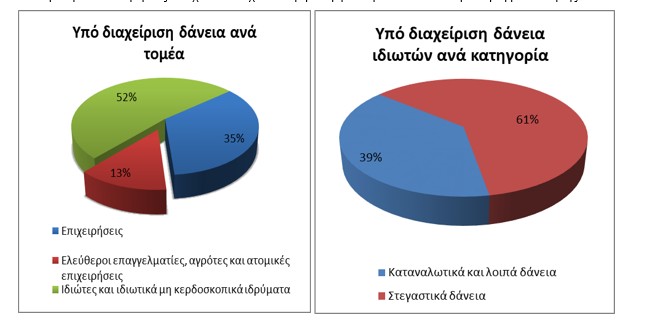 Η ονομαστική αξία των υπό διαχείριση δανείων προς ιδιώτες και ιδιωτικά μη κερδοσκοπικά ιδρύματα μειώθηκε κατά 610 εκατ. ευρώ έναντι του προηγούμενου τριμήνου και διαμορφώθηκε σε 41.365 εκατ. ευρώ στο τέλος του γ΄ τριμήνου του 2025. Αναλυτικότερα, τα υπό διαχείριση καταναλωτικά δάνεια παρουσίασαν μείωση κατά 492 εκατ. ευρώ και διαμορφώθηκαν σε 15.762 εκατ. ευρώ. Τα υπό διαχείριση στεγαστικά δάνεια παρουσίασαν μείωση κατά 116 εκατ. ευρώ και διαμορφώθηκαν σε 25.254 εκατ. ευρώ.