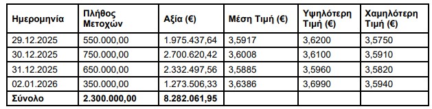 H ΑΛΦΑ ΤΡΑΠΕΖΑ (η ‘Τράπεζα’), σε συνέχεια της από 17.09.2025 ανακοίνωσής της, ενημερώνει ότι, στο Πλαίσιο του Προγράμματος Αγοράς Ιδίων Μετοχών που εγκρίθηκε με την απόφαση της Έκτακτης Γενικής Συνέλευσης των Μετόχων της με ημερομηνία 12.6.2025, κατά το διάστημα 29.12.2025 – 02.01.2026, προέβη σε αγορά μέσω του Χρηματιστηρίου Αθηνών συνολικά 2.300.000 ίδιων μετοχών, με μέση τιμή κτήσης 3,6009 € ανά μετοχή και συνολικό κόστος 8.282.061,95 €.