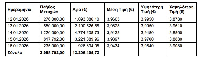 H ΑΛΦΑ ΤΡΑΠΕΖΑ (η ‘Τράπεζα’), σε συνέχεια της από 17.09.2025 ανακοίνωσής της, ενημερώνει ότι, στο Πλαίσιο του Προγράμματος Αγοράς Ιδίων Μετοχών που εγκρίθηκε με την απόφαση της Έκτακτης Γενικής Συνέλευσης των Μετόχων της με ημερομηνία 12.6.2025, κατά το διάστημα 12.01.2026 – 16.01.2026, προέβη σε αγορά μέσω του Χρηματιστηρίου Αθηνών συνολικά 3.098.792 ίδιων μετοχών, με μέση τιμή κτήσης 3,9391 € ανά μετοχή και συνολικό κόστος 12.206.405,72 €.
