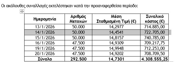 Σε υλοποίηση του εγκεκριμένου προγράμματος επαναγοράς ιδίων μετοχών, η Εθνική Τράπεζα ανακοίνωσε την απόκτηση 292.500 κοινών μετοχών κατά το διάστημα από 13 έως 20 Ιανουαρίου 2026.