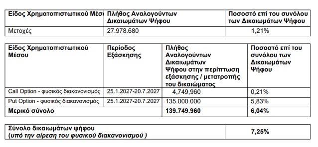 Παράλληλα, η αμερικανική επενδυτική τράπεζα έχει στην κατοχή της χρηματοοικονομικά προϊόντα που, υπό την προϋπόθεση φυσικού διακανονισμού, μπορούν να οδηγήσουν στην απόκτηση επιπλέον 139,75 εκατ. μετοχών, που αντιστοιχούν σε ποσοστό 6,04% των δικαιωμάτων ψήφου.