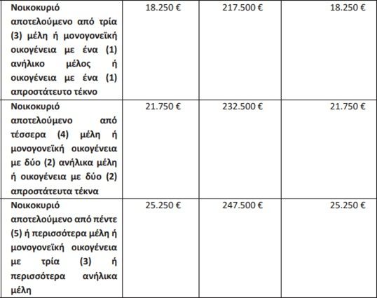 | Νοικοκυριό αποτελούμενο από 3 μέλη ή μονογονεϊκή οικογένεια με 1 ανήλικο μέλος ή οικογένεια με 1 απροστάτευτο τέκνο | 14.500 € | 155.000 € | 14.500 € |