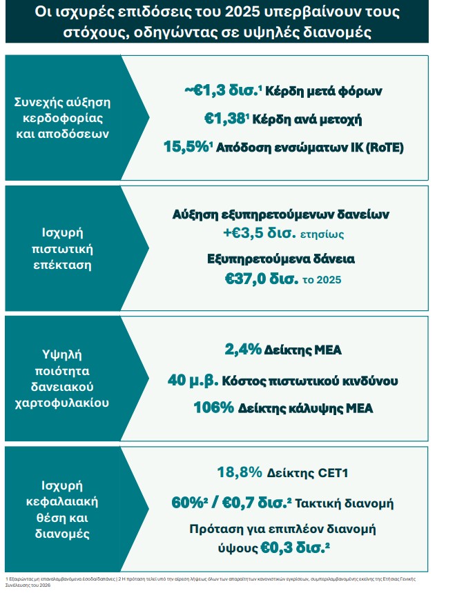 Τα αποτελέσματά μας για το 2025 αποτυπώνουν τη ραγδαία μας πρόοδο και την ευνοϊκή συγκυρία της ελληνικής οικονομίας, ο συνδυασμός των οποίων μας επέτρεψε να επιτύχουμε με άνεση τους στρατηγικούς μας στόχους, μετατρέποντας τα πλεονεκτήματα του Ισολογισμού και την κεφαλαιακή μας υπεροχή σε υψηλής ποιότητας κερδοφορία και ανάπτυξη. Ο Όμιλος κατέγραψε κέρδη μετά από φόρους ύψους €1,3 δισ., τα οποία μεταφράζονται σε κέρδη ανά μετοχή ύψους €1,41, με τον δείκτη απόδοσης ενσώματων ίδιων κεφαλαίων (RoTE) να διαμορφώνεται σε 15,5%. Η επίδοση αυτή ήταν αποτέλεσμα της ισχυρής πιστωτικής μας επέκτασης, με τα εξυπηρετούμενα δάνεια να αυξάνονται κατά €3,5 δισ. ή +10% σε ετήσια βάση, ενώ η διψήφια αύξηση των εσόδων από προμήθειες αντανακλά τις σταυροειδείς πωλήσεις κυρίως επενδυτικών προϊόντων. Η στρατηγική διαχείρισης του κόστους μας συνδυάζει την συγκράτηση των εξόδων με τις απαιτούμενες επενδύσεις σε τεχνολογία και ανθρώπινο κεφάλαιο, καθώς επιδιώκουμε να προσφέρουμε ακόμα πιο καινοτόμα προϊόντα και υπηρεσίες υψηλής ποιότητας στους πελάτες μας.