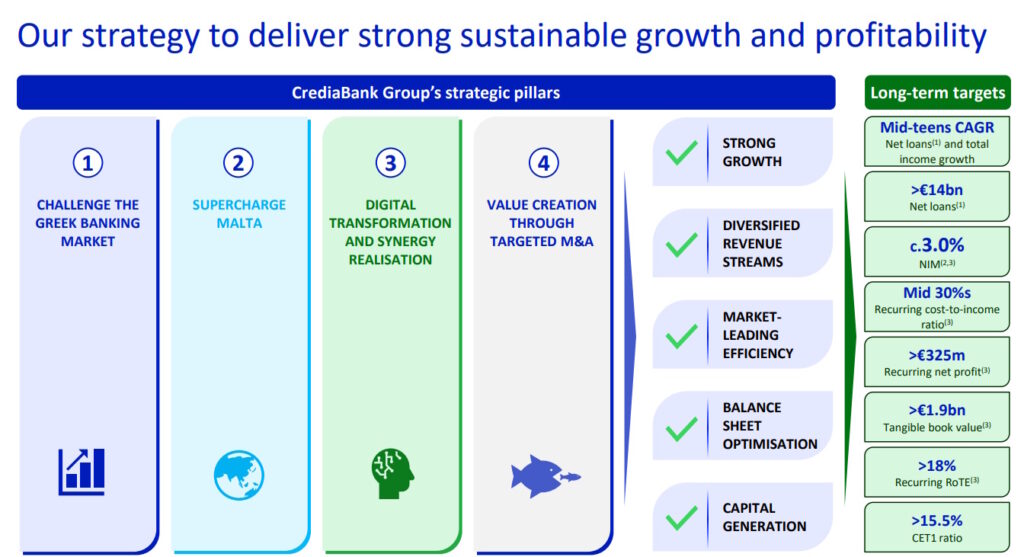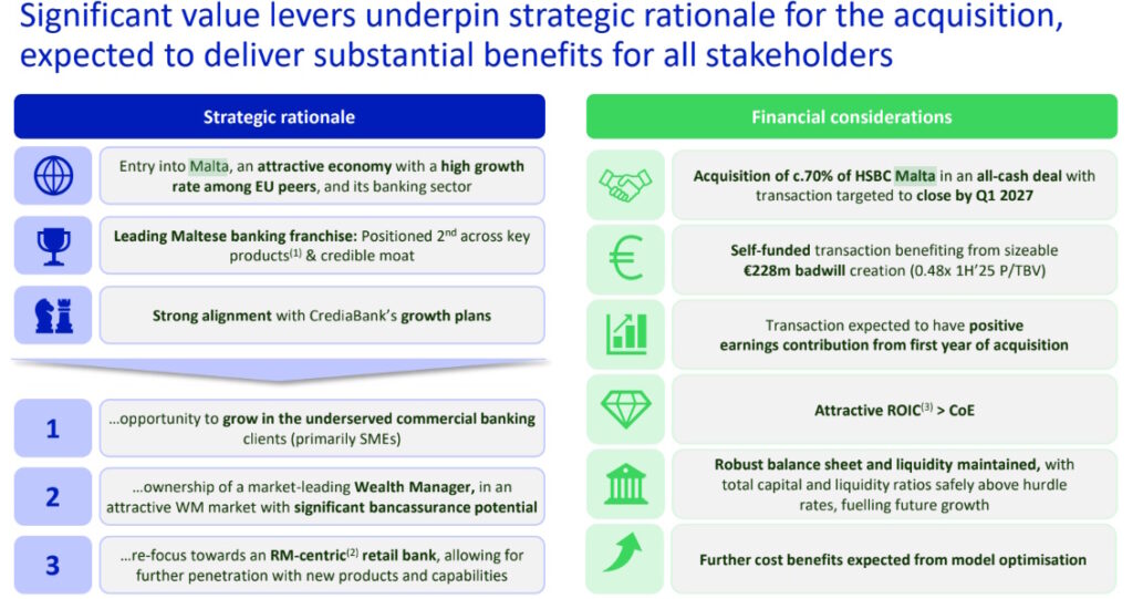 Iδιαίτερα για τη Μάλτα, η CrediaBank βλέπει σημαντικές δυνατότητες δημιουργίας αξίας, σε μια οικονομία που συγκαταλέγεται στις ταχύτερα αναπτυσσόμενες της Ευρωζώνης. Το πλάνο περιλαμβάνει αξιοποίηση της υφιστάμενης πελατειακής βάσης, ανάπτυξη στη χρηματοδότηση ΜΜΕ και αναβάθμιση των λειτουργικών διαδικασιών.