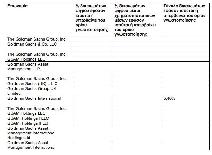 Κατ’ εφαρμογή των προβλέψεων του Ν. 3556/2007, η Alpha Bank A.E. («Alpha Bank») ανακοινώνει ότι, σύμφωνα με την από 1 Απριλίου 2026 γνωστοποίηση της Goldman Sachs Group Inc. στο πλαίσιο του άρθρου 11 παρ. 1(α) και 1(β) του Ν. 3556/2007, η τελευταία κατέχει έμμεσα από την 27.3.2026, 41.146.729 κοινές, ονομαστικές μετοχές που αντιστοιχούν σε ποσοστό 1,78% επί του συνόλου των δικαιωμάτων ψήφου της Alpha Bank, καθώς και χρηματοοικονομικά προϊόντα τα οποία, υπό την αίρεση του φυσικού ή χρηματικού διακανονισμού, δύνανται να οδηγήσουν στην απόκτηση 87.016.859 κοινών μετοχών που αντιστοιχούν στο 3,76% του συνόλου των δικαιωμάτων ψήφου της Alpha Bank.