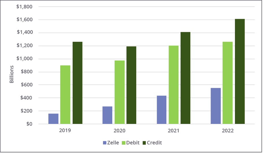 Έτσι, το σύνολο της αξίας των πληρωμών μέσω πιστωτικών των τριών τραπεζών αυξήθηκε κατά 29%, από 1,23 τρισ. δολάρια το 2019 σε 1,6 τρισ. δολάρια το 2022. Το ίδιο διάστημα, οι συναλλαγές μέσω χρεωστικών αυξήθηκαν από 9 τρισ. σε 1,2 τρισ. δολάρια. Και οι πληρωμές μέσω Zelle κατά 250% (!), από 158 δισ. δολάρια το 2019 σε 554 δισ. το 2022.