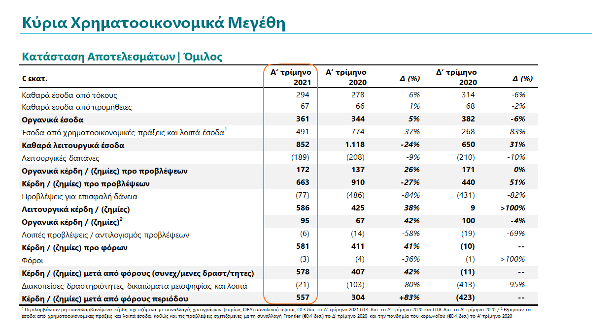 «Ισχυρά οικονομικά αποτελέσματα καταγράφηκαν σε όλους τους βασικούς τομείς της επιχειρηματικής μας δραστηριότητας: κερδοφορία, ποιότητα του δανειακού χαρτοφυλακίου και κεφαλαιακή επάρκεια. Όσον αφορά στην κερδοφορία, επιτύχαμε αξιοσημείωτα αποτελέσματα, με τα κέρδη μετά από φόρους του τριμήνου να ανέρχονται σε €560 εκατ., αντανακλώντας τη συνεχή βελτίωση σε όλες τις λειτουργικές γραμμές των αποτελεσμάτων μας, καθώς και τα ισχυρά κέρδη από χρηματοοικονομικές πράξεις. Τα οργανικά κέρδη του Ομίλου για το Α’ τρίμηνο 2021 ανήλθαν σε €95 εκατ., σημειώνοντας αύξηση κατά 42% σε ετήσια βάση, αντικατοπτρίζοντας τα υψηλότερα οργανικά έσοδα και τις αισθητά μειωμένες λειτουργικές δαπάνες, με το δείκτη κόστους προς οργανικά έσοδα να διαμορφώνεται στο 52%, βελτιωμένος κατά σχεδόν 9 ποσοστιαίες μονάδες σε σύγκριση με το προηγούμενο έτος.