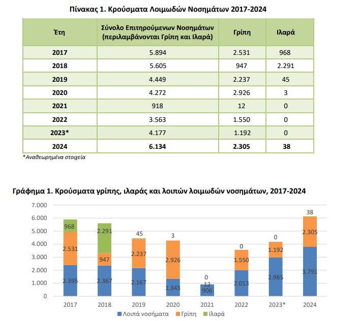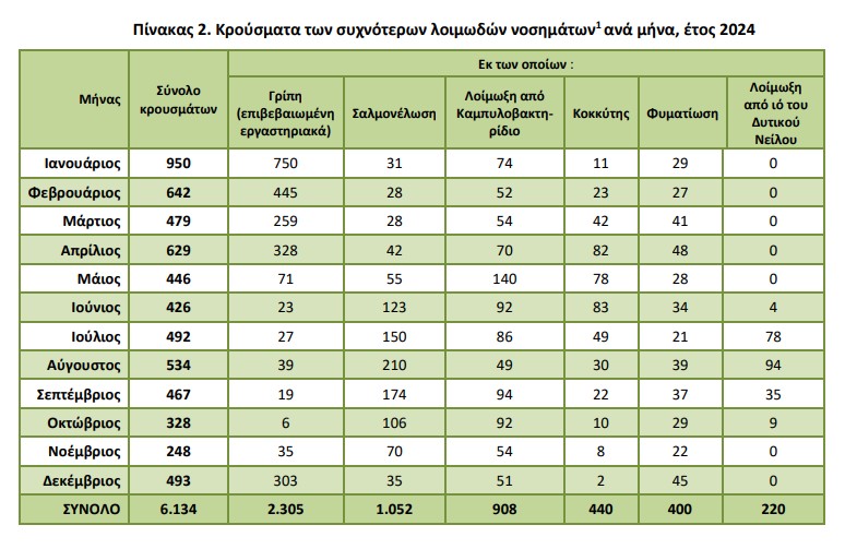 Στη σχετική έρευνα, παρουσιάζεται επίσης ο συνολικός αριθμός των κρουσμάτων και η εποχικότητα έξι λοιμωδών νοσημάτων, τα οποία εμφάνισαν περισσότερα από 200 επιβεβαιωθέντα και νοσηλευθέντα κρούσματα το έτος 2024. Η γρίπη παρουσίασε εποχικότητα κυρίως τους χειμερινούς μήνες, ενώ τα περιστατικά μειώθηκαν την άνοιξη και παρέμειναν χαμηλά από τον Ιούνιο έως τον Νοέμβριο. Συνολικά, αναφέρθηκαν 2.305 κρούσματα για το 2024 σε σχέση με 1.192 το 2023, καθιστώντας τη γρίπη τη συχνότερη λοίμωξη του έτους, με ποσοστό αύξησης 93,4%. Συγκριτικά με το 2023, το 2024 η σαλμονέλωση αυξήθηκε κατά 12,4% και η φυματίωση μειώθηκε κατά 19,2%. Με βάση τον αριθμό των καταγεγραμμένων κρουσμάτων, η σαλμονέλωση εμφάνισε τα περισσότερα κρούσματα τους καλοκαιρινούς μήνες, από Ιούνιο έως και Οκτώβριο, ενώ τα περισσότερα κρούσματα φυματίωσης παρουσιάστηκαν τους μήνες Μάρτιο, Απρίλιο και Δεκέμβριο. Η λοίμωξη από καμπυλοβακτηρίδιο παρουσίασε συνολικά 908 κρούσματα, με αυξητική τάση από το Μάιο έως τον Οκτώβριο. Σε σχέση με το 2023, το 2024 παρατηρήθηκε αύξηση 37,8%. Ο κοκκύτης κατέγραψε 440 κρούσματα το 2024 παρουσιάζοντας σημαντική αύξηση σε σχέση με το 2023 κατά το οποίο δηλώθηκαν 12 κρούσματα. Η λοίμωξη από τον ιό του Δυτικού Νείλου κατέγραψε συνολικά με 220 κρούσματα, εμφανίζοντας θερινή εποχικότητα, καθώς τα περιστατικά περιορίζονται στους μήνες από Ιούνιο έως Οκτώβριο. Σε σχέση με το 2023 η λοίμωξη αυξήθηκε κατά 35,8%.