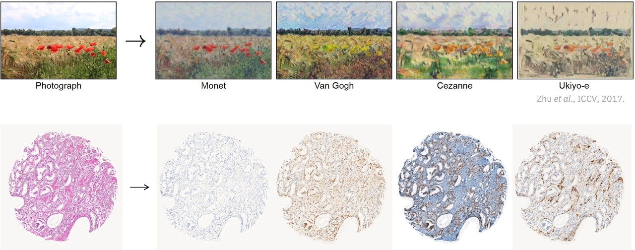 Στην εικόνα παραλληλίζεται η παραγωγή εικόνων από τον «VirtualMultiplexer« για τους καρκινικούς ιστούς με τις εφαρμογές που μετατρέπουν μια φωτογραφία σύμφωνα με το στυλ διάσημων ζωγράφων (Credit: Zhu et al. ICCV, 2017 / M. Rapsomaniki (UNIL-CHUV)